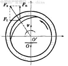 高速離心機(jī)轉(zhuǎn)子或其它空心高速轉(zhuǎn)子在內(nèi)壁的局部吸附油或水汽等冷凝后的液體,當(dāng)轉(zhuǎn)軸旋轉(zhuǎn)時(shí),這種液體會(huì)使轉(zhuǎn)子失穩(wěn)。如圖3,當(dāng)轉(zhuǎn)軸高速轉(zhuǎn)動(dòng)時(shí),液體沿00′的方向甩向轉(zhuǎn)子內(nèi)壁。但此液體并不是停留在00′的延長(zhǎng)線上,而是因粘性被帶至沿長(zhǎng)線一側(cè),其重心位于與00′夾角為Ψ的直線上。將液體的離心力Fs分解為Ft和Fn兩個(gè)分力,因Ft與O0′垂直,故使轉(zhuǎn)子發(fā)生失穩(wěn)而產(chǎn)生振動(dòng),其產(chǎn)生的頻率一般為轉(zhuǎn)速頻率。